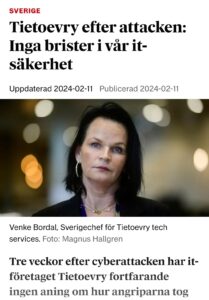 Det syns i Tietoevry kommunikation, och responsen på den. Deras officiella linje lyder: “Inga brister i vår IT-säkerhet”. Det är ett fullständigt anmärkningsvärt uttalande, delvis för att det bevisligen är fel. Trots detta passerar det utan nämnvärd motreaktion.